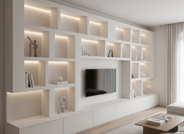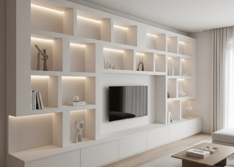 El Resultado: Estanterías de obra minimalistas, nichos decorativos iluminados para arte o esculturas, cabeceros de cama integrados en la pared y vestidores que nacen de la propia estructura. Diseño continuo y limpieza visual absoluta.