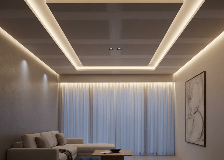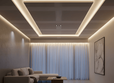 La Técnica: Diseño y ejecución milimétrica de candilejas perimetrales, fosas en techos para ocultar focos, y cortineros integrados que permiten que las tiras LED bañen las cortinas o paredes de forma indirecta.